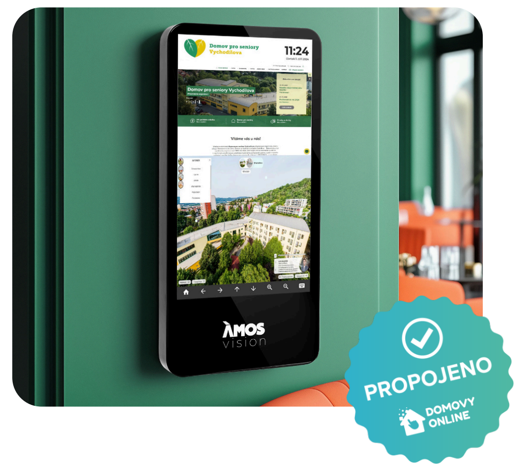 Domovy Online tvoří moderní weby pro sociální zařízení a celý ekosystém online nástrojů pro efektivnější komunikaci s veřejností, ÁMOS vision přináší dotykové panely pro interní komunikaci. Jejich propojením vzniká efektivní nástroj pro sdílení důležitých informací uvnitř i navenek.