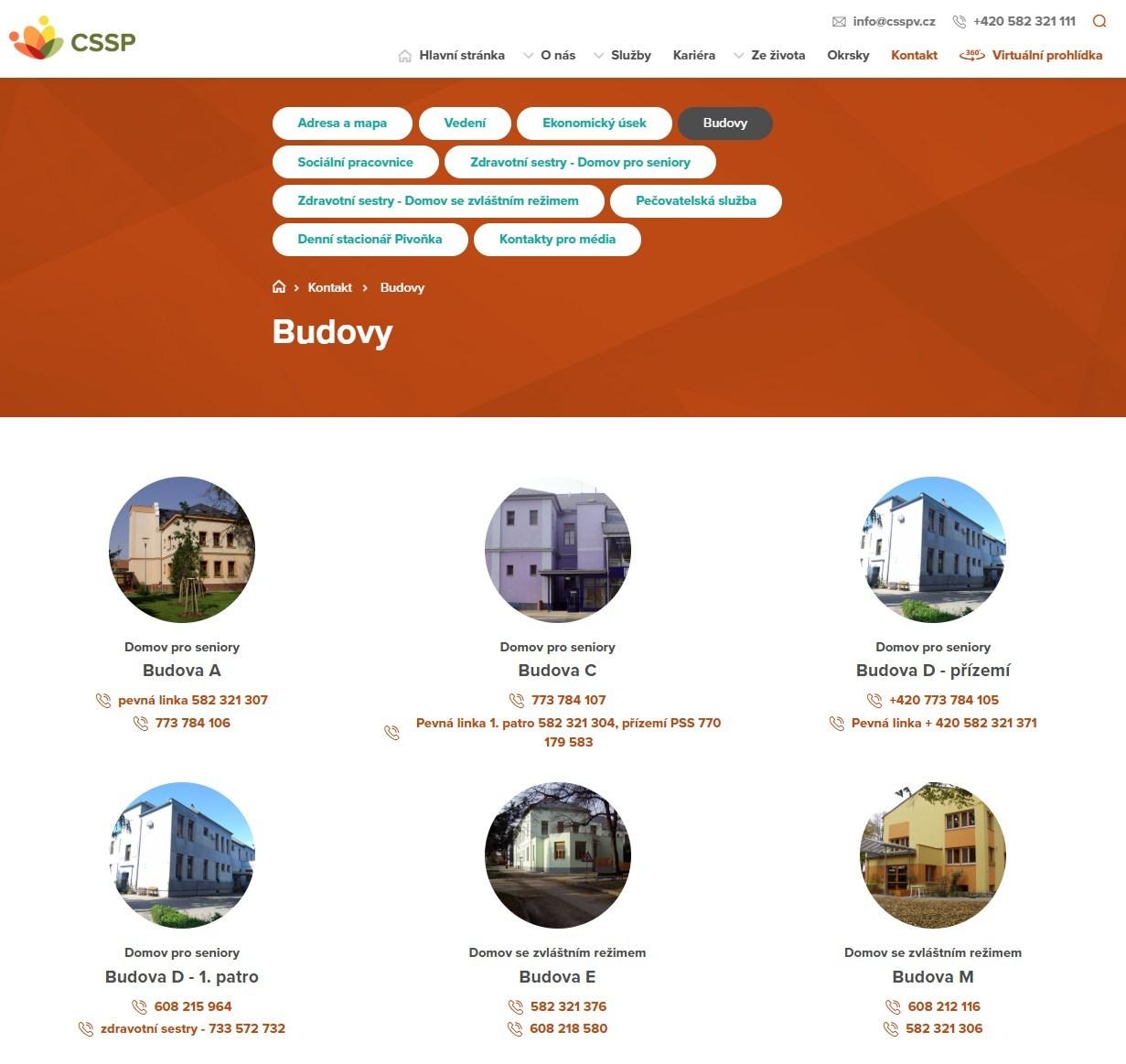 Kontakty lze rozdělit logicky do samostatných sekcí (například: „Recepce“, „Ošetřovatelské oddělení“, „Sociální oddělení“, „Ekonomický úsek“, „Administrativa“, „Vedení“.) To pomůže návštěvníkům webu rychle najít a zvolit správný kontakt.