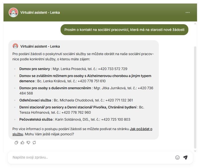 Nejmodernější a velmi efektivní pomocník, který vám najde správný kontakt a poskytne okamžité odpovědi na běžné dotazy. Uživatelé tak nemusí posílat e-mail nebo vyplňovat formulář a čekat na odpověď sociální pracovnice — potřebné informace získají okamžitě a v případě potřeby je návazně přesměruje na odpovědnou osobu.